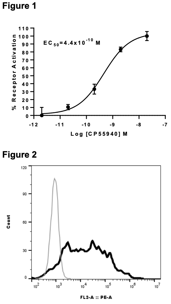 Figure 1. Dose-dependent stimulation of intracellular cAMP accumulation upon treatment with ligand, measured with MULTISCREEN™ TR-FRET cAMP 1.0 No Wash Assay Kit (Multispan MSCM01). Figure 2. Receptor expression on cell surface measured by flow cytometry (FACS) using an anti-FLAG antibody. Thin line: parental cells; thick line: receptor-expressing cells.