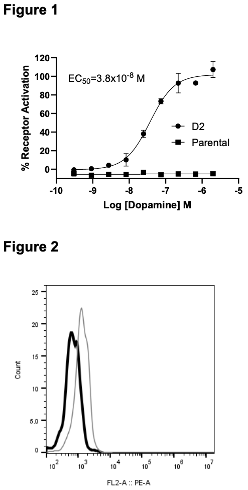 Figure 1. Dose-dependent stimulation of calcium flux upon treatment with ligand, measured with MULTISCREEN™ Calcium 1.0 No Wash Assay Kit (Multispan MSCA01). Figure 2. Receptor expression on cell surface measured by flow cytometry (FACS) using an anti-FLAG antibody. Black line: parental cells; gray line: receptor-expressing cells.