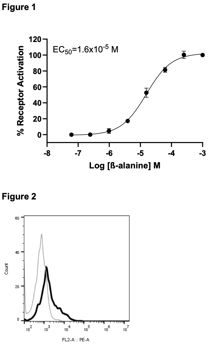 Figure 1. Dose-dependent stimulation of calcium flux upon treatment with ligand, measured with MULTISCREEN™ Calcium 1.0 No Wash Assay Kit (Multispan MSCA01). Figure 2. Receptor expression on cell surface measured by flow cytometry (FACS) using an anti-FLAG antibody. Black line: parental cells; gray line: receptor-expressing cells.
